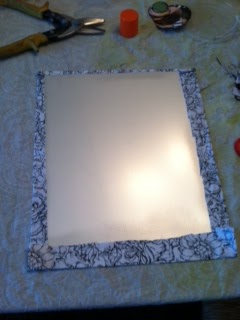 Cut the fabric so it slightly overlaps your metal sheet (to avoid fraying of edges). Spray sheet with spray adhesive and lay on to fabric. Use your hands to push down and smooth out any wrinkles in the fabric.