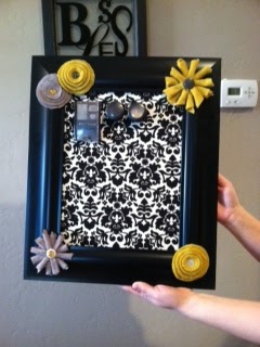 Put sheet into frame, glue on flowers, and attach makeup to board! Done! :)