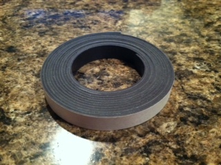 Glue magnets (this roll I bought at Hobby Lobby for $2.50) and cut pieces to fit the back of each individual makeup piece you want on your board.